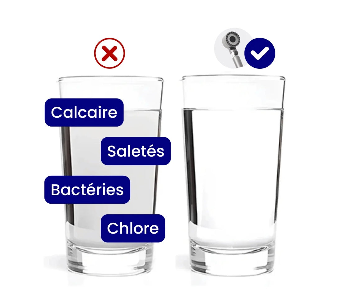 Éliminez 98% du chlore qui est responsable des pellicules, des cheveux secs et des frisottis